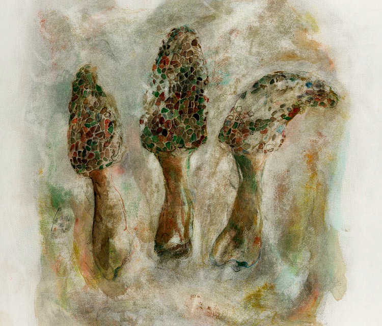 “Three Morels” 2004 (mixed media on paper, 30 x 22″) dc