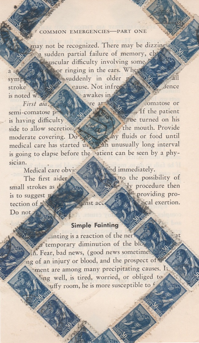 “Common Emergencies” 2014 (stamp collage on vintage paper, 6 x 4″) dc