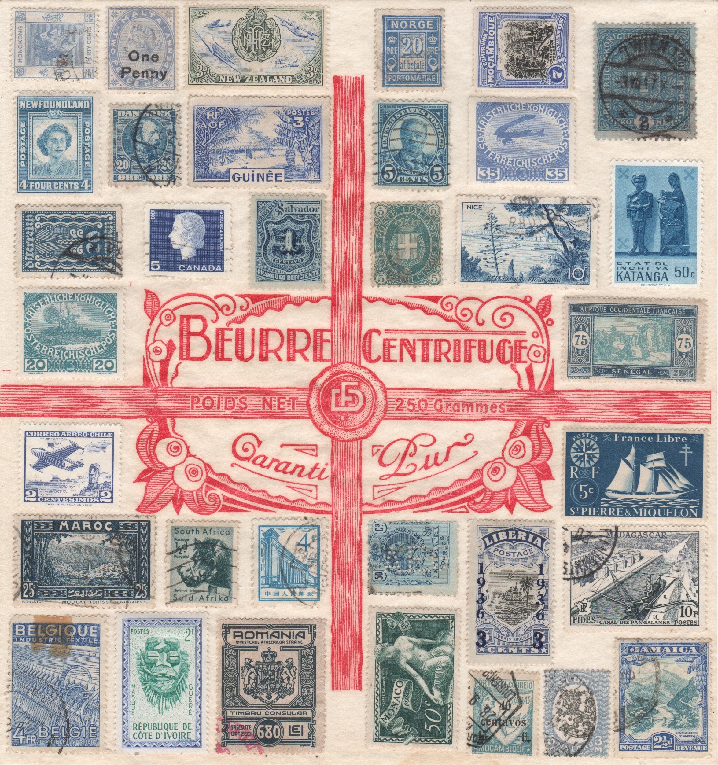 “Blues” 2013 (stamp collage on old French paper, 7 x 7″) dc